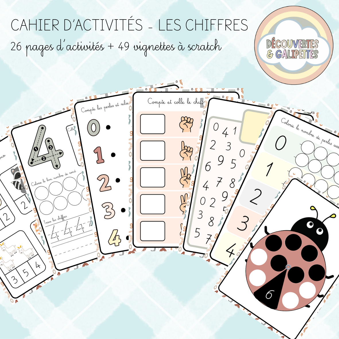 - D'une partie pratique : 16 pages d'activités sont incluses : jeu de mémo pour replacer les chiffres sur 3 grilles différentes, compter sur les doigts d'une main et sur un dé puis replacer la vignette correspondante, relier le chiffre associé à un nombre de perle, dénombrer avec une coccinelle tournante...