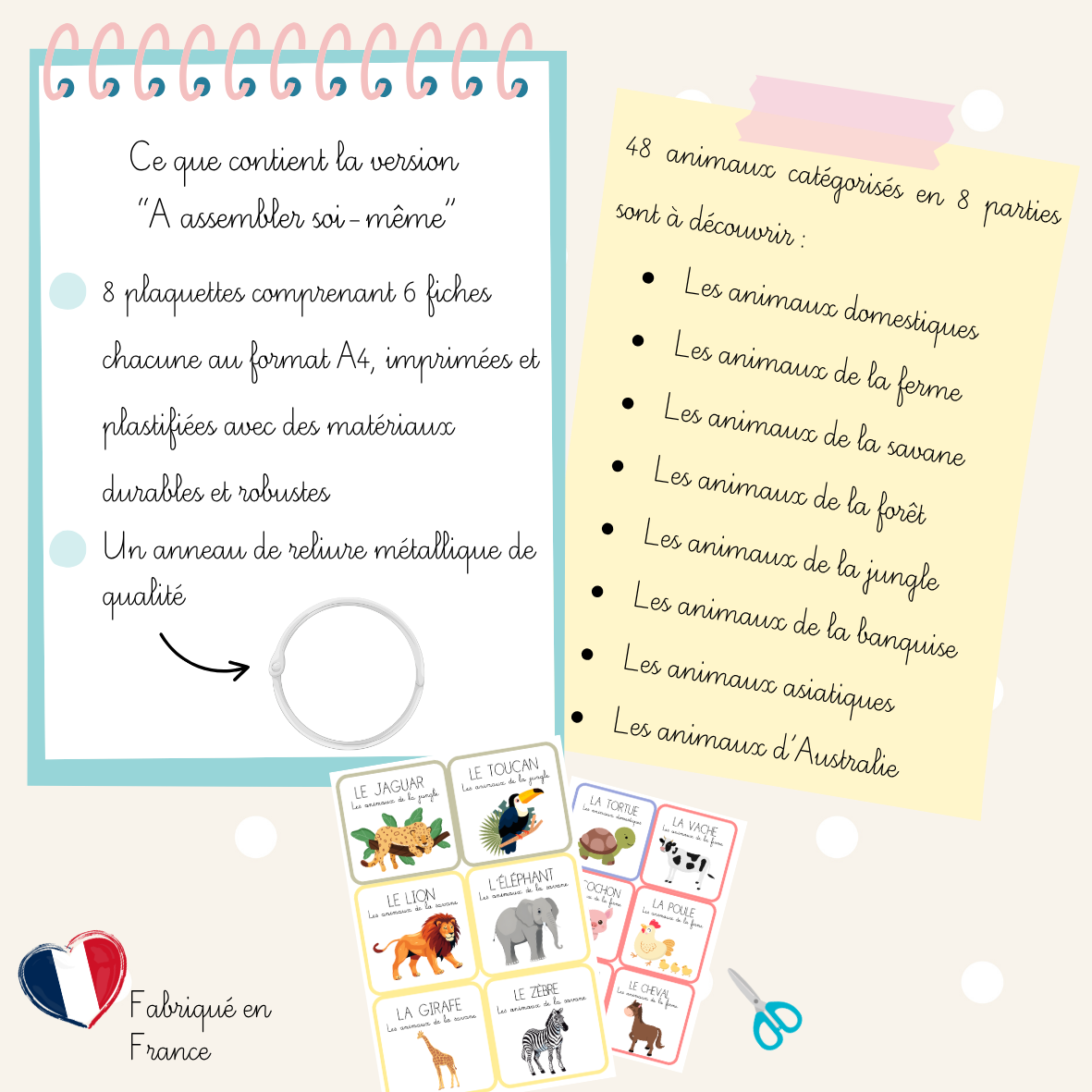 L’imagier contient 48 cartes illustrées, réparties en plusieurs univers :