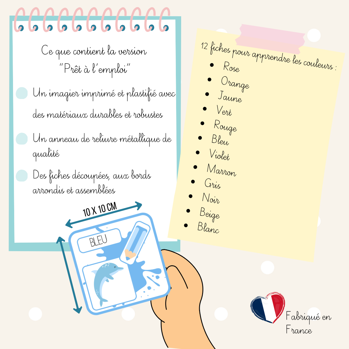 Conçu pour les enfants dès 2 ans , cet imagier plastifié de 12 cartes au format 10x10 cm , reliées par un anneau solide, propose une découverte simple et visuelle des couleurs de base , à travers des illustrations parlantes et un design épuré.