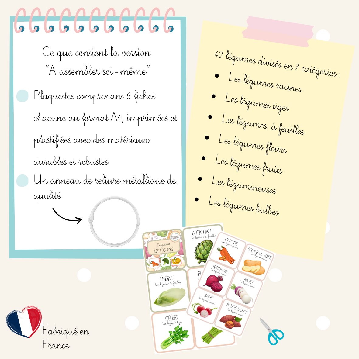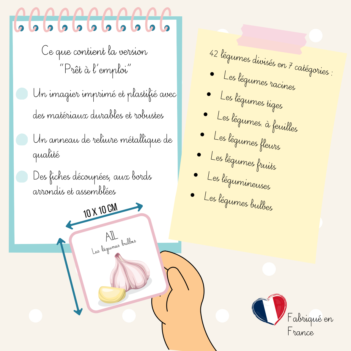 Pensé pour les enfants dès 2 ans, cet imagier plastifié de 42 cartes, au format 10x10 cm, est relié par un anneau en métal solide pour faciliter la manipulation. Chaque carte présente un légume en photo réaliste, son nom clairement écrit, ainsi que sa catégorie : une façon simple et visuelle d’explorer la diversité des légumes tout en enrichissant le vocabulaire.