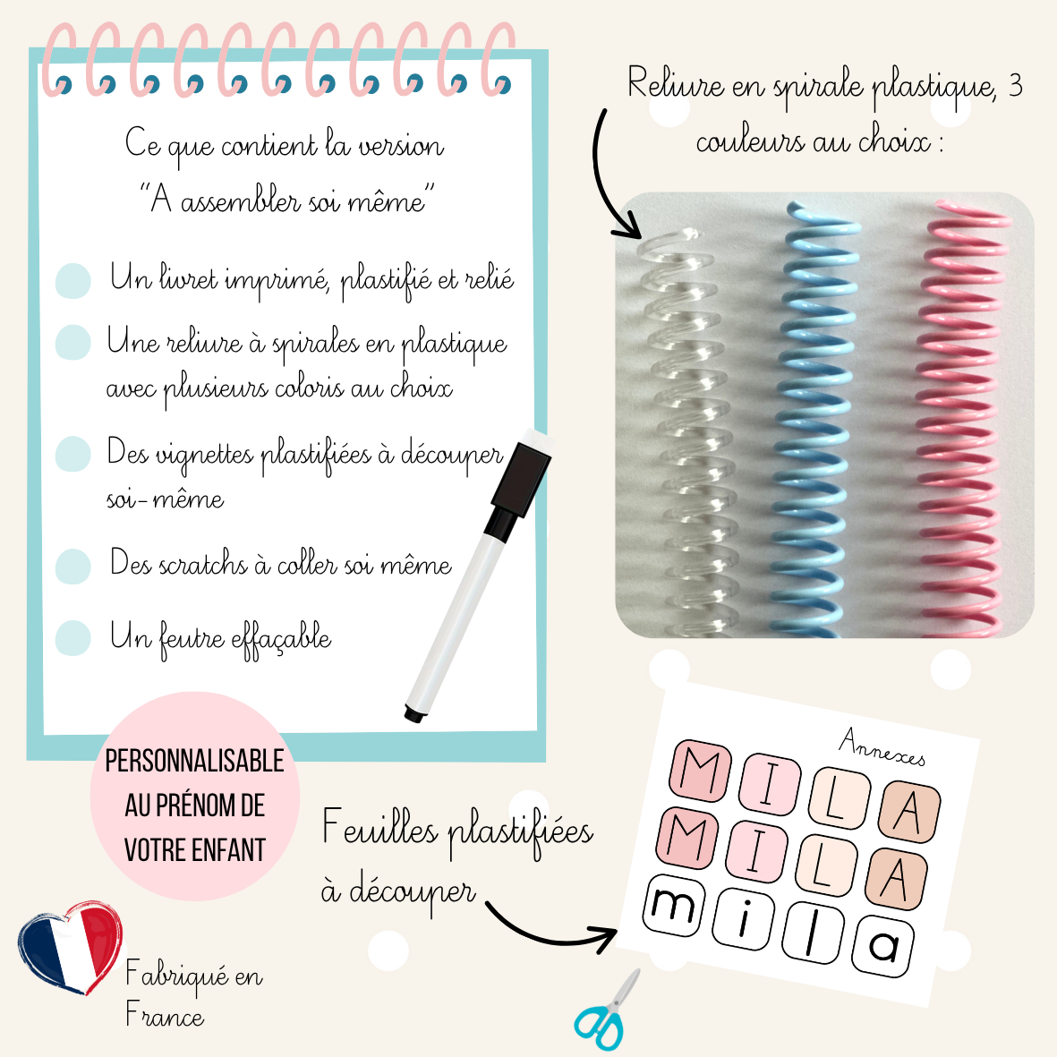 Ce cahier plastifié de 10 pages d’activités propose un parcours progressif autour du prénom de l’enfant, avec des vignettes à scratch associées.
